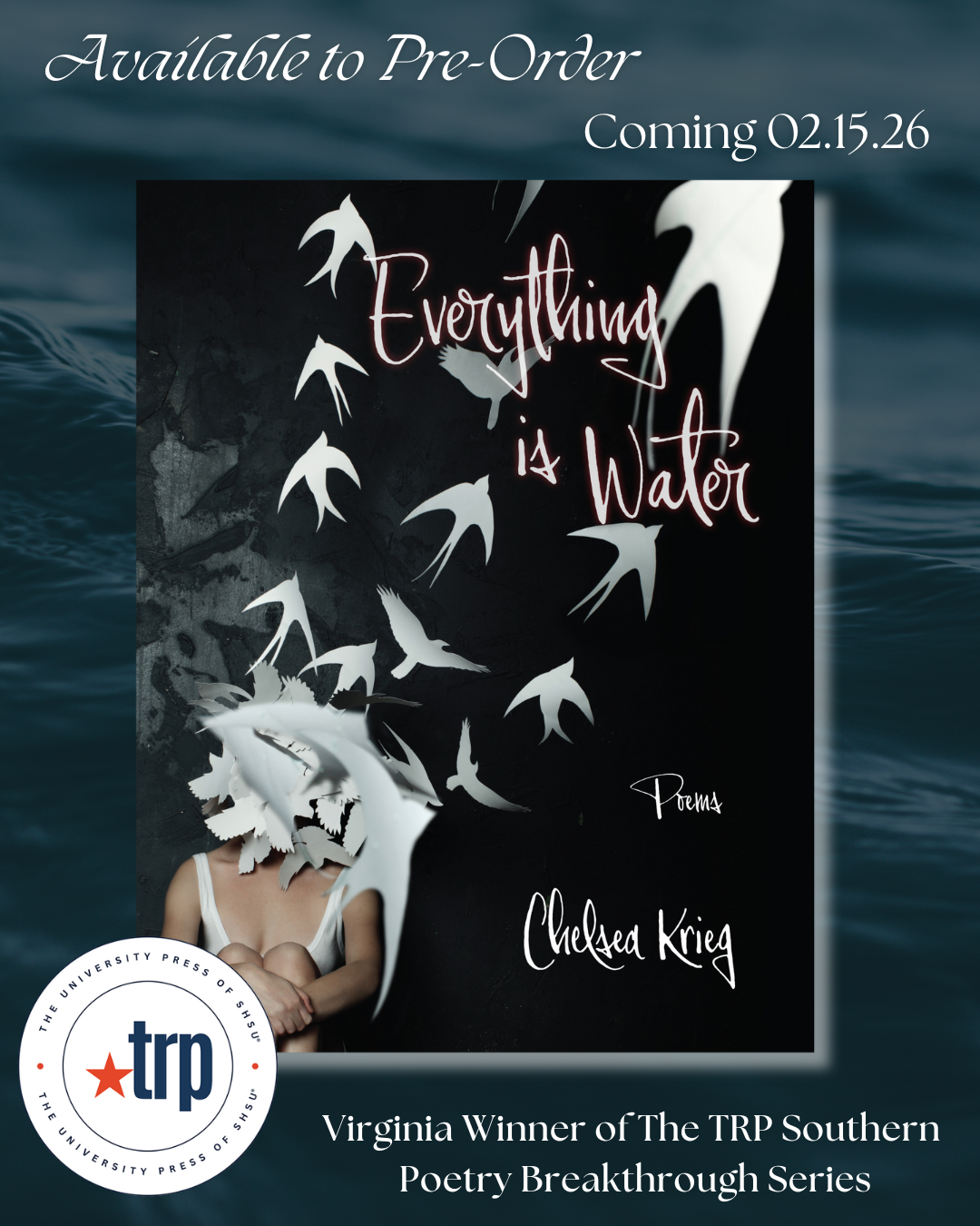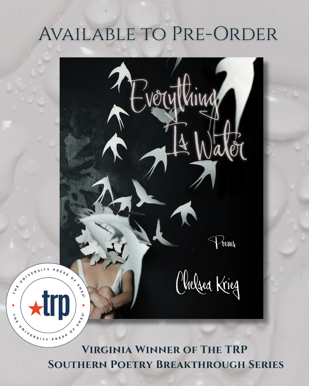 Everything Is Water is an open letter to caregivers as the speaker grapples with her partner’s life-threatening illness, pregnancy and new motherhood, and marriage. Growing up on the Virginia coast, the speaker knows the water’s danger and allure—asks, what is beneath, what has control in so much open and unknown space? The speaker continues to feel this unease in everything as she navigates fear, identity, and loss. Everything is water. Everything is the surface tension created by the unknown. The collection often returns to the water and those inhabiting it, but it also looks to winged creatures, those on land, and those who are in between elements as they wrestle with their own survival. Water is an element that sustains and devours. When danger comes, we wonder when it will end. We ask how we can live with loss. Is it easier to run away? To let go? Everything Is Water leaves the reader suspended, treading water alongside the speaker as she seeks to answer these questions.